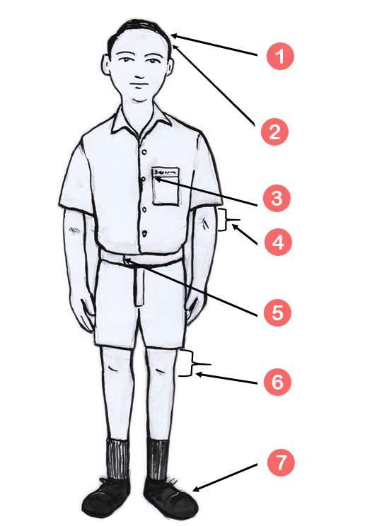 - හිස මුදුන කොටස කොණ්ඩය දිග අඟල් 2කි. හිස පැත්තේ කොටස හා මුදුන කොටස වෙන් වෙන් වශයෙන් පෙනෙන සේ නොතිබිය යුතුය.