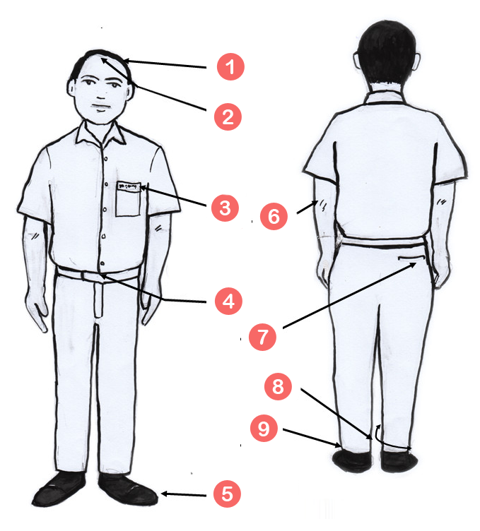 - කලිසමේ පසුපස සාක්කුව දකුණු පසින් තිබිය යුතුය.